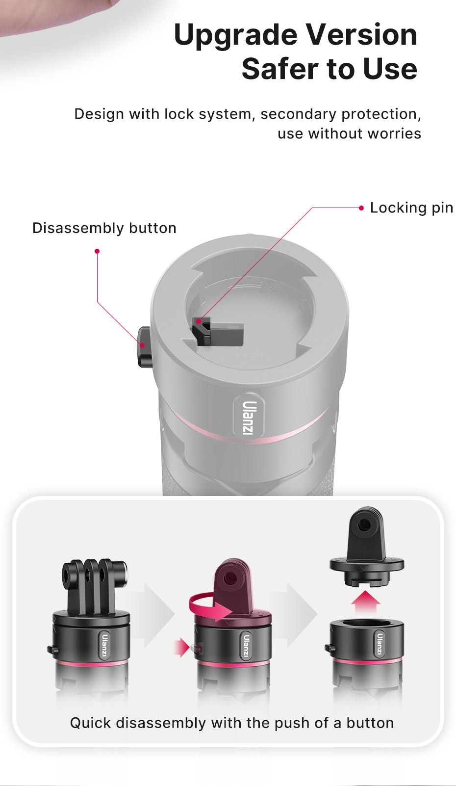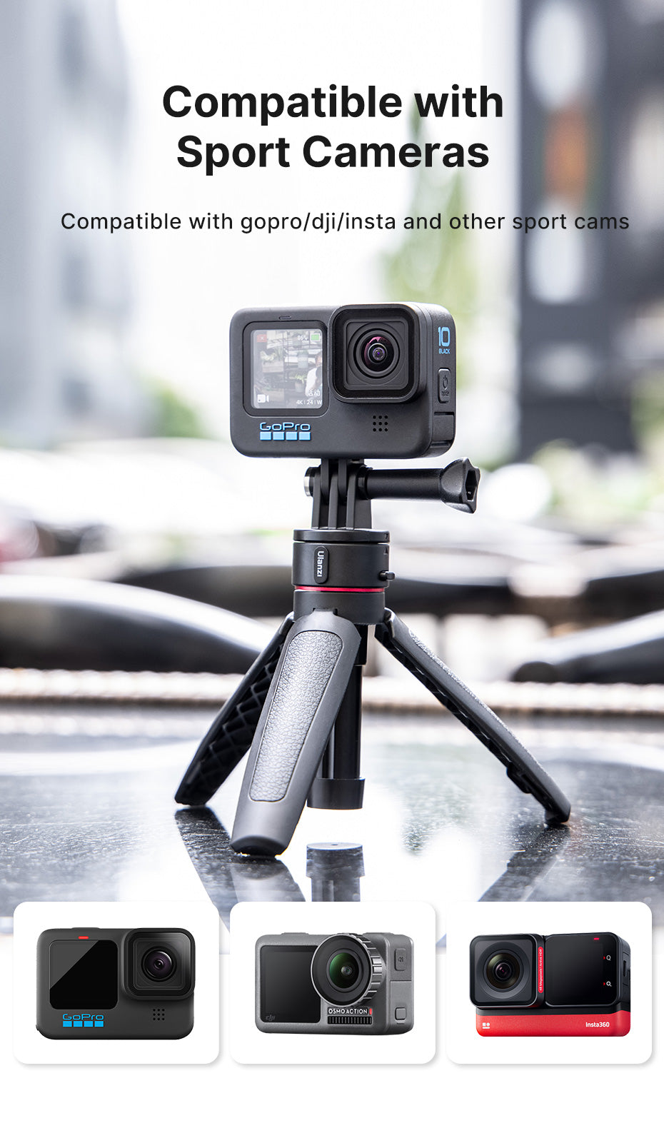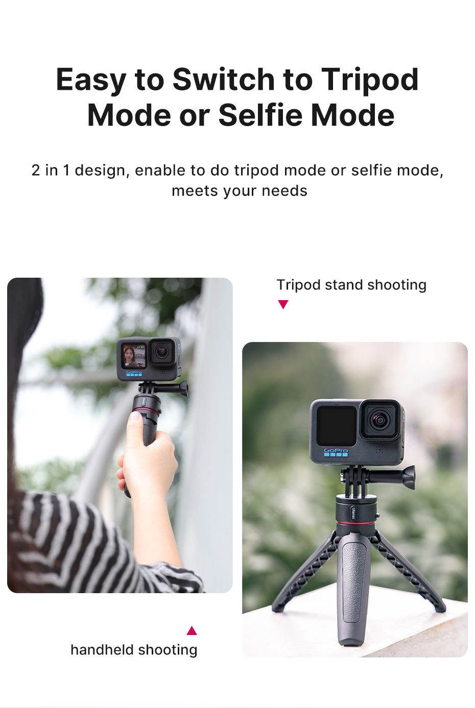 With three articulating legs and an integrated extension pole, this Go Quick II 2-in-1 Mini Tripod can accommodate most action cameras and function as both a selfie stick and a mini tripod all in one device. The 2-prong mount included with the tripod attaches via a magnetic locking connection and is compatible with GP, DJI, and Insta360 action cameras. A built-in 4-section extension pole has a total range of 5.7 to 10.4".